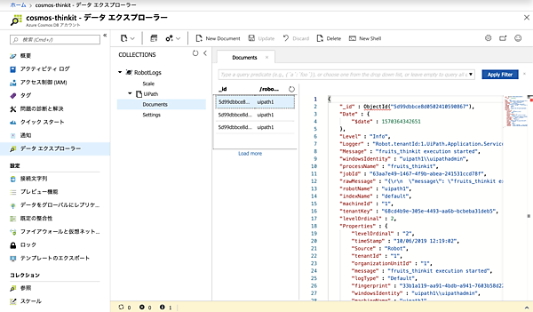 それでは早速、ロボット上で作成済みのワークフローを実行します。Cosmos DBのメニューへ戻ってデータエクスプロラーを覗いてみると、データが連携されていることが確認できます。