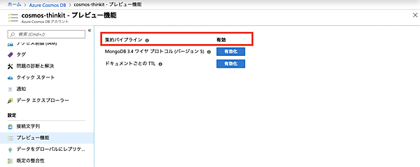 最後に、プレビュー機能のメニューにある「集約パイプライン」というオプションを有効にしておきます。これにより、MongoDBの集計機能(aggregation pipeline)がAzure Cosmos DBでも使用できるようになります。