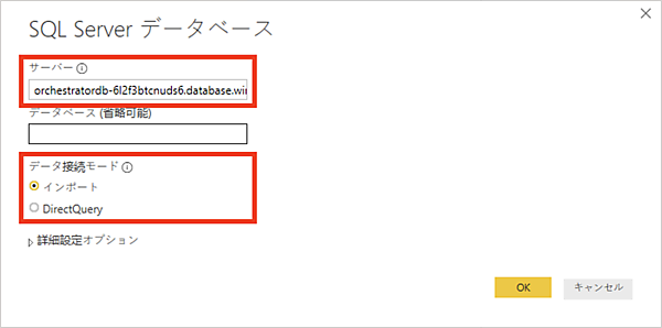 「SQL Server データベース」というウィンドウが開くので、接続するための情報を入力します。サーバーにはSQL Serverのサーバ名を入力し、データ接続モードは「インポート」を指定します。インポートとは、SQL ServerよりViewを通してビジュアライズするためのデータをコピーし、使用するものです。