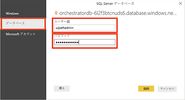 次のウィンドウでは、左側のパネルで認証方法を選択します。「データベース」をクリックしてSQL Serverの資格情報を入力しましょう。この手続きを誤ると、誤った資格情報がキャッシュされるため、メインのウィンドウからキャッシュされた情報をクリアしなくてはなりません。私はそもそも左側のパネルに気付かず、また誤った資格情報もキャッシュされてしまい、かなりつまずきました。