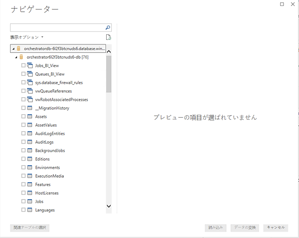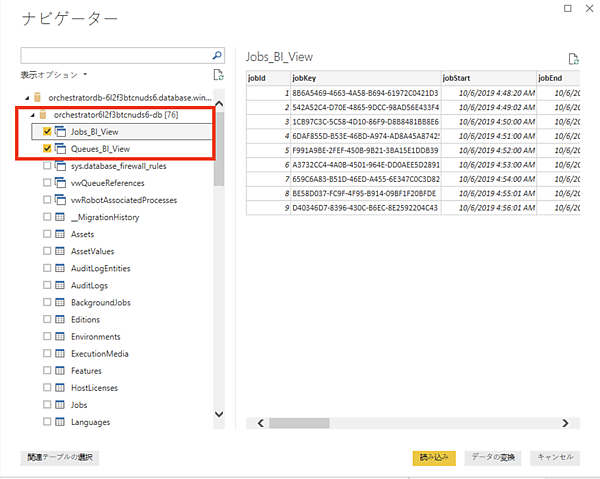 先ほど作成したViewもきちんと表示されています。「Jobs_BI_View」と「Queues_BI_View」を選択し、接続します。
