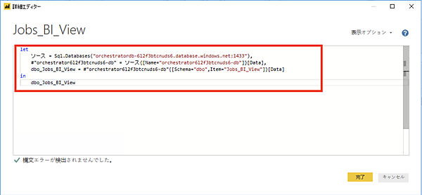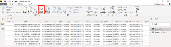 ダウンロードしたテンプレートから、再度「Jobs Dashboard 1.0.0.pbix」をダブルクリックで起動します。これがジョブの情報をビジュアライズするためのPower BIのテンプレートです。このテンプレートを起動した画面でも詳細エディタを起動し、先ほどコピーした情報を上書きします。