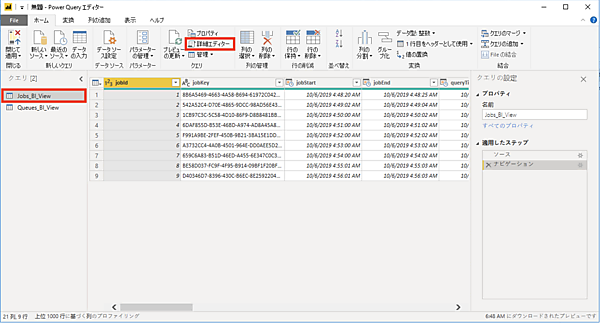 遷移した画面でクエリに「Jobs_BI_View」を指定し、「詳細エディタ」をクリックします。なお、今回はビュジュアライズする範囲をジョブ情報のみとします。