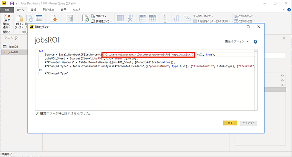 また、クエリ「jobsROI」を選択してExcelファイルのパスを修正し、テンプレートのExcelファイルへのパスへと更新します。ExcelファイルはROIを計算する際の係数で、必要に応じて自身のプロセスを登録してみてください。