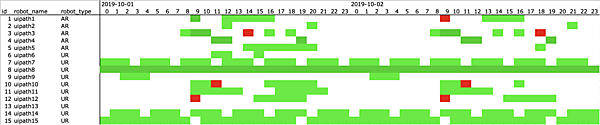 また、ジョブの実行時間より、プロセスとロボットの観点でのヒートマップも生成が可能です。下記はロボット単位でヒートマップを作成した際のイメージです。