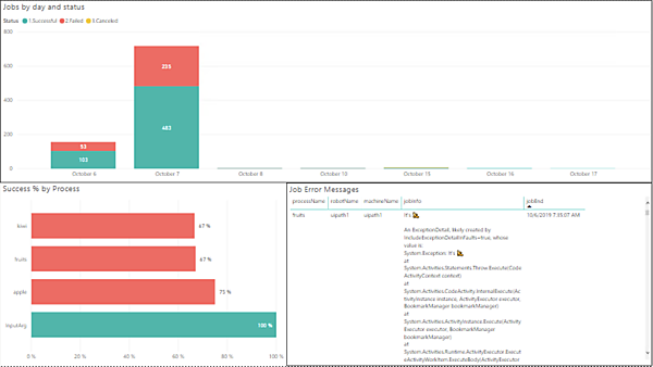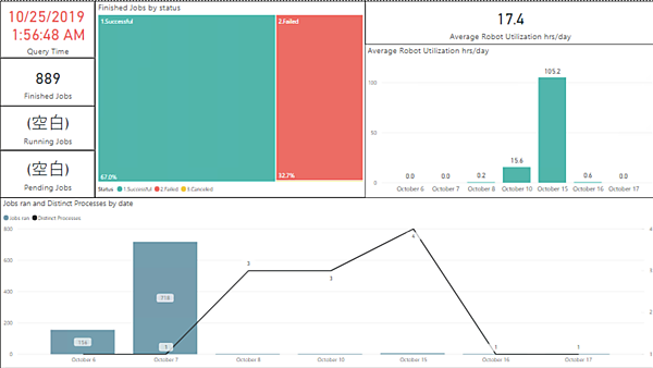 また、Orchestratorとそのビジュアライズを用いるとロボットの稼働状況の把握、のらロボットの検知、ジョブの実行結果の可視化が可能となり、RPAを推進する上でガバナンスを効かせるための有用な一手となるものと考えます。
