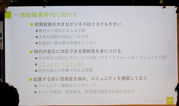 また、自分を中心としたコミュニティ作りの重要性にも言及。「インターネットは狭い世界の重なり合いで成り立っている」と指摘した上で、自分中心のコミュニティ作りで大切なことは、まず「自分がどうしてやるのかメッセージを発信し、心地良い場作りと、その場を気に入ってくれた人にコミュニティの存在を伝えること」だと言う。コミュニティ運営で気をつけていることは「メンバーがどうしたいかを察し、選択肢を増やす中でモチベーションを保つように努めること」。また「リーダーは万能でなくて良く、人に頼れることも大切」とリーダーに陥りがちな点にも触れ、第3部を締めくくった。