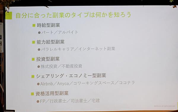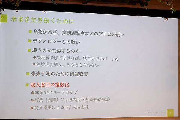 さらに、過去の栄光にすがらず、伸びる業界に自分の強みを重ね、時代の波に乗ることを推奨する、と染谷氏。自身の収入について「クリック課金型や成功報酬型(アフィリエイト)などインターネット関連の仕事が多いが、今ではネット収入の他に、セミナーや企業へのコンサルティング、オンラインサロン、書籍執筆など、現実社会とインターネット上との収入のバランスを取り、一極集中しないようにしている」と紹介した。