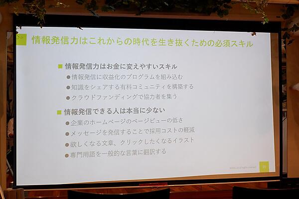 また、情報を発信する場としてはインターネットの活用を推奨。その理由は諸経費や集客のリスクが少ないためだ。ただし、特にインターネットは自分の欲しい情報しか取得できない傾向が強いため、視野が狭くなりがち。染谷氏は「トレンドやリサーチを知るには、書店に行ったり街歩きしたりなど、現実社会とネットとの差分を見つけることが大切。アイデア・発信力・メッセージで世界は変わる! ぜひ行動を!」と呼びかけた。