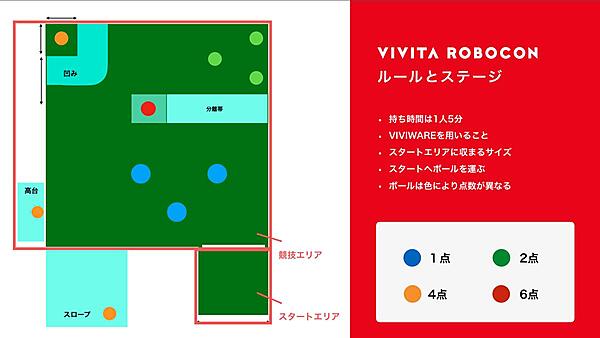 ここで、VIVITA ROBOCONのルールを説明しよう。VIVITA ROBOCONへの参加条件はたったの1つ。「VIVIWARE Cell」をロボットの制御に使⽤すること。ロボットはスタートエリアに収まるサイズなら大きさは問わない。持ち時間は5分間で、競技エリアに設置されたボールの獲得点数で競われる。ボールの点数は位置や色により異なっている。