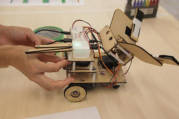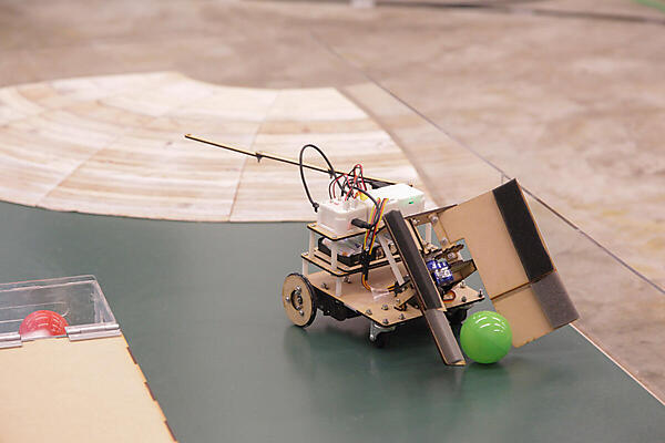 りくさん(柏の葉)の「ロボ」。取り外し可能なアームや棒により難題である高台やくぼみのボールも難なく取得し満点ゲット。クリア時の制限時間により惜しくも優勝を逃したが、即興でレーザーカッターによる賞状とメダルが作られた。