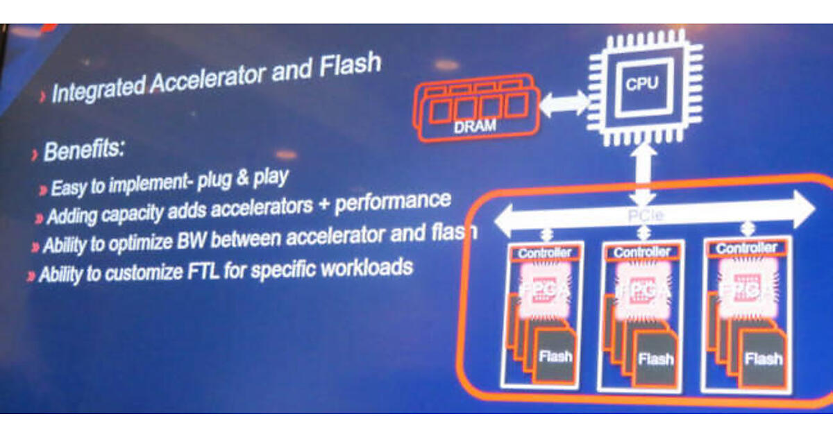 この発想をストレージに応用したのが、CSD(Computational Storage Drive)だ。これは初日のキーノートでAWSの担当者がFPGAの応用として解説していたもので、このブレークアウトセッションではフラッシュドライブとの組み合わせによる実装を解説するものとなった。