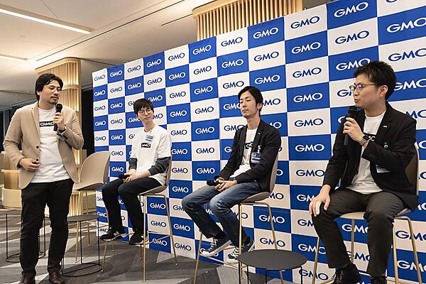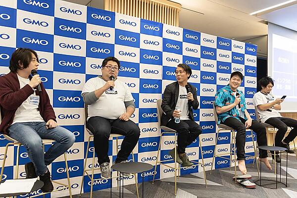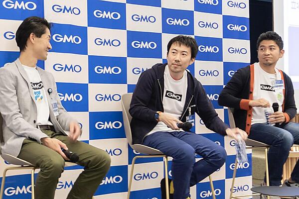 最初のセッションでは「アプリケーション開発者の多様性」をテーマに、 GMOあおぞらネット銀行・櫃ノ上貴士氏、GMOアドマーケティング・石丸智輝氏、GMOペイメントゲートウェイ・橋本玄基氏をスピーカーに、モデレーターにGMOインターネット・成瀬允宣氏が加わりパネルトークが行われた。