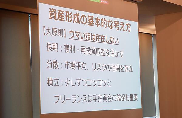 「お金のこと何もわからないままフリーランスになっちゃいましたが税金で損しない方法を教えてください!」(サンクチュアリ出版刊)の著者である大河内氏は、「お金は仕事で稼ぐのが一番。資産形成の前にまずは種銭を作ることが大事。金融資産を増やことに目を向けすぎて騙されてしまったケースが多い。フリーランスは、まずは現金を積み重ねることが大事」と語る。鈴木氏も「フリーランスはお金だけでなく人的資産など、お金以外の資産を幅広くとった方が良い」という。日頃からフリーランスとよく会っているという中山氏は「今、自分は信頼資産か金融資産の時期か、立ち位置を見極めることが大事。自分を商品と捉え、自分の信頼価値を上げていくことが全てのベースでは」と示唆した。また鈴木氏は「複利を利用したり財産を分散させるなど、日本のものだけでなくSP500のインデックス(S&P ダウ・ジョーンズ・インデックスが算出しているアメリカの代表的な株価指数)など世界の経済に目を向けることも大切」とリスク分散の大切さにも触れた。