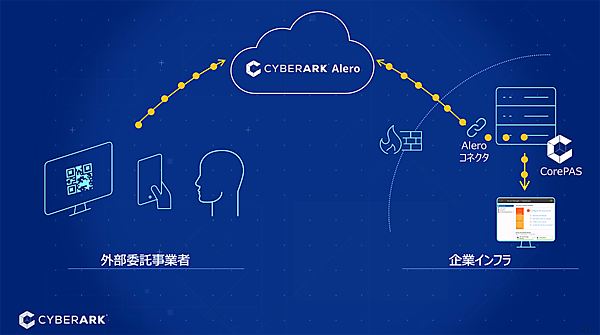 外部委託事業者を「招待」するとQRコードが送られてくる。そのリンク先では、FIDOと似た仕組みでスマートフォンの顔認証などパスワードレスで認証を行えるようになっており、成功すればALEROに接続できる仕組みだ。あとは社内向けの場合と同様にCore Privileged Access Securityから特権IDを払い出し、限定された範囲でアクセスを許可する。