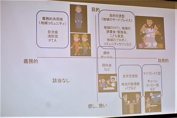 そもそも地域とは何か。「『地域とつながる』と言うと自分の故郷や在住先と考えがちだが、自分がファンになった地域ならばどこでも良いのではないか」と石山氏は問いかけた。地域のコミュニティとはサードプレイス(家でも仕事場でもない第三の居心地の良い場所)のこと。地域にも色々なコミュニティがあり、自発的・義務的、目的・癒しなど、何を求めて行くかにより異なる。
