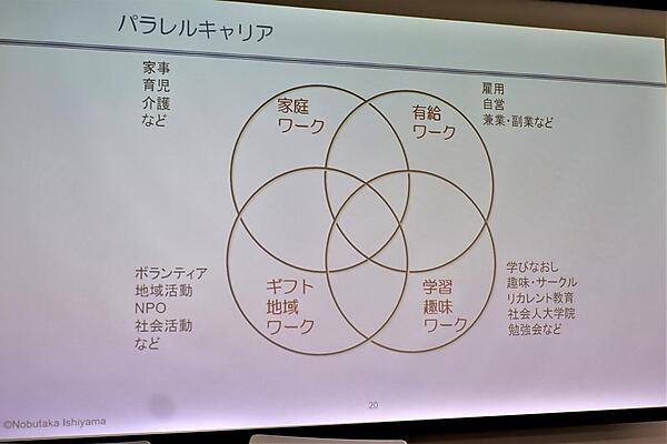 これまでは「地域と関わる」というと移住か観光等でお金を落とすことが主流だったが、移住でも観光でもなく地域とゆるくつながり、その地域のファンになるのも良い。石川氏のパラレルキャリアの定義は、下図で示す4つのうち2つ以上を行うこととした上で「関係人口で地域に関わることはパラレルキャリアにもなり、地域と仕事を通じて関わることは、個人にとって越境学習にもなる」と言及した。