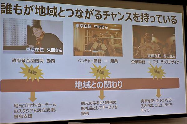 北川氏自身が宗像市の出身者で、2017年に沖ノ島が世界遺産登録されたことをきっかけに、東京在住の宗像市出身者が集まって「故郷に何かできないか」と設立されたのが「リトル宗像」だ。同章では、キャリアの限界を感じながらも地域の面白さに気づいたメンバーが実家を活用したシェアハウスをつくり、そこから生まれたコミュニティを通じて地域と人が繋がるコミュニティデザインというキャリアを築き上げた事例を紹介している。「初めは小さくとも、誰でも地域とつながる事で新たなキャリアを築いていくことができる」と北川氏は語った。