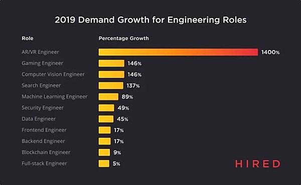 開発者向け求人プラットフォームHiredは、2019年のAR/VR関連の求人が前年比で1400%と大幅に増加したことを受け、AV/VRは今後5年間の求人面で最も勢いがある分野であるとの見込みを発表しました。