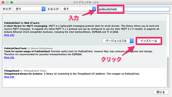 右上のテキストボックスに「pubsubclient」と入力し、PubSubClientの「インストール」をクリックします。