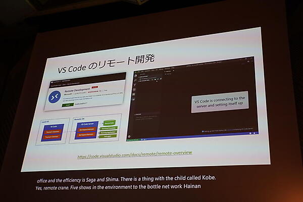 最初に説明したのは開発環境だ。Visual Studio Codeでは、リモートでソースコード編集やランタイムなどを共有して作業できるVisual Studio Live Shareや、リモートのVisual Studio Codeサーバーに接続してリモート開発する機能、そのサーバーをMicrosoftのマネージドサービスで動かすVisual Studio Onlineなどがある。