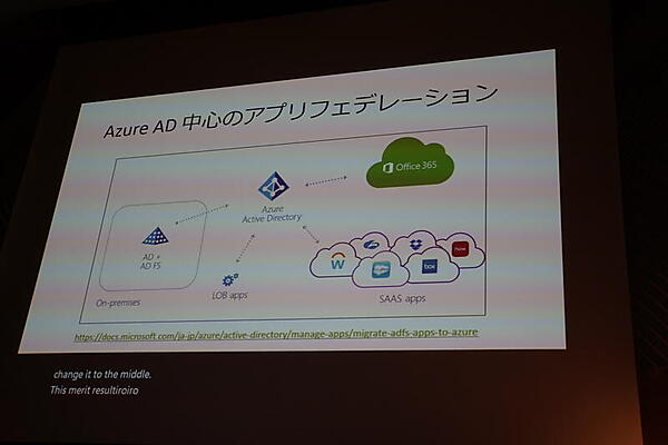 レベル1はアプリケーションの認証だ。Office 365を導入すると自動的にAzure AD(Azure Active Directoryが構築される。Azureやその他のSaaSアプリはAzure ADとの連携が基本だという。これによって、クラウドアプリとのシンプルな連携や、安全なアクセス、IDプロバイダーのメンテナンス削減が実現できる。