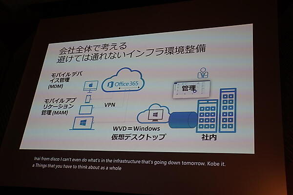 レベル3は、社内インフラ環境の整備で、MDM(モバイルデバイス管理)、MAM(モバイルアプリケーション管理)、VPN、WVD(Windows仮想デスクトップ)などを含む。これについて増渕氏は、Microsoft IntuneやMicrosoft Azure Virtual WAN、Windows Virtual Desktop(WVD)によるクラウド管理を紹介した。