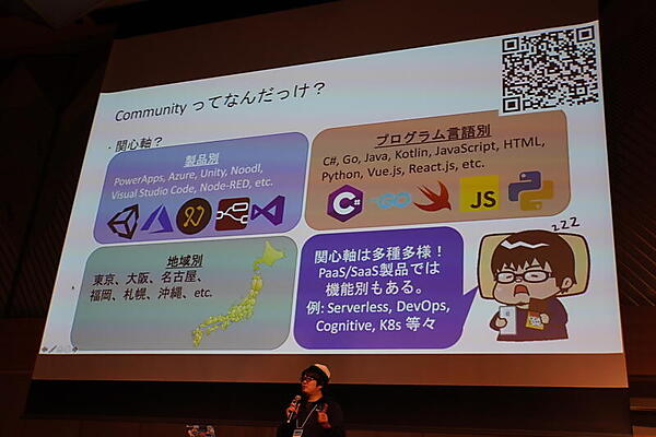 マイクロソフトの小田氏は技術者の「コミュニティ」という言葉について、共通の関心軸をもとに集まる場所や集団のことと定義した。関心軸には、製品別、プログラミング言語別、地域別、さらにプロダクトの中の機能別などがある。