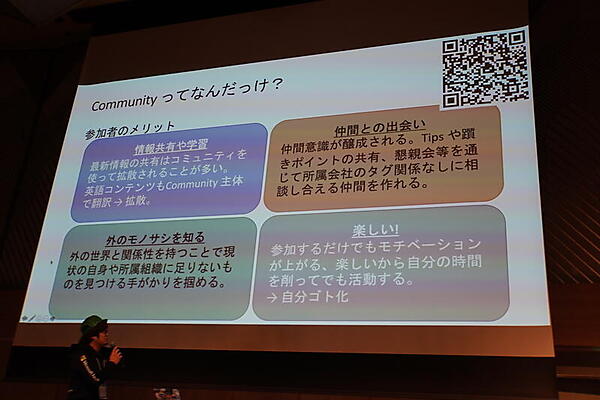 セッション内で参加者に向け質問を行い、コミュニティへの参加経験者が少なかったことから「いつどうやって開催されている?」「何をやっている?」などを改めて紹介した。中でも「参加して何かいいことあるの?」については、参加者にとっても運営者にとっても、情報共有や仲間との出会い、外のモノサシを知ることができる、なにより楽しい、といったことを小田氏は強調した。