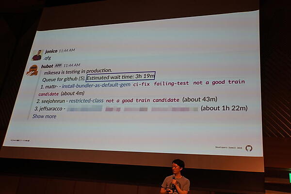 さらに、2015年にはデプロイ回数が週400強に達し、デプロイ待ちが数時間に及ぶようになったことから、複数の変更を1つにまとめてデプロイする「リリーストレイン」を採用していることも紹介された。これは元々、1チームで作った仕組みが社内ブログで紹介されて全社に広がったということで、田中氏はGitHubの草の根インナーソースの文化の例だと語った。