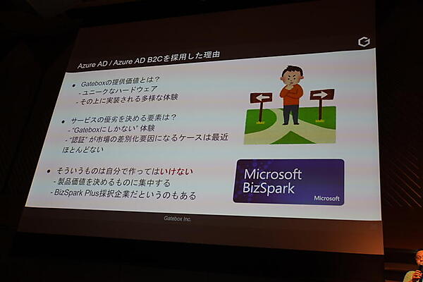 Gateboxの久森達郎氏のセッション「GateboxにおけるAzure AD/AD B2Cを基盤としたID Centricな組織・サービス・プラットフォームの設計」では、キャラクターと一緒に暮らすためのキャラクター召喚装置「Gatebox」について、他社との協業を踏まえたビジネスモデルに合わせ、ID中心の設計思想を軸としてどのようにサービスプラットフォームを設計したかについて紹介した。