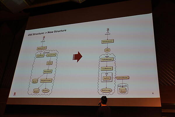 楽天の柳本浩一氏と日本マイクロソフトの新井庸介氏のセッション「楽天がモノリス→マイクロサービス&オンプレ→クラウドで経験した光と闇」では、楽天グループ内で利用されてきた画像参照のための共通システムを、AzureやKubernetesによるモダンなアーキテクチャへ移行したことについて、そこでのチャレンジや遭遇したトラブルを紹介した。