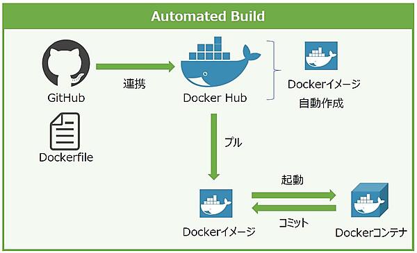 また、Docker HubはDockerイメージの移動や管理、Dockerイメージを共有する場としての役割を果たします(いわゆるリポジトリ)。Docker Hubの「Automated Build」の機能でGitHubと連携させれば、自動でDockerイメージを作成することもできます。
