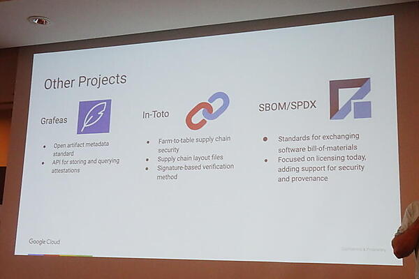 CDFのプロジェクトとしては、まずCDパイプラインツールのTektonがある。そのほか、メタデータのクエリのGrafeasや、サプライチェーン記述のIn-Toto、ソフトウェア部品表のSBOM/SPXをLorenc氏は紹介した。