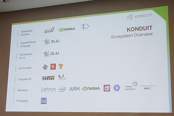 氏はまず、Konduitのエコシステムとして、Sparkなどの分散ランタイム、C++ランタイム、ファイルフォーマット、深層学習コンパイラ、ハードウェア、言語ごとのパッケージングなどを挙げた。