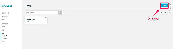 IoT Coreのルールにアクセスして、右上の「作成」をクリックしてください。