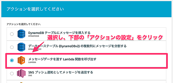 「メッセージデータを渡すLambda関数を呼び出す」をクリックしてください。