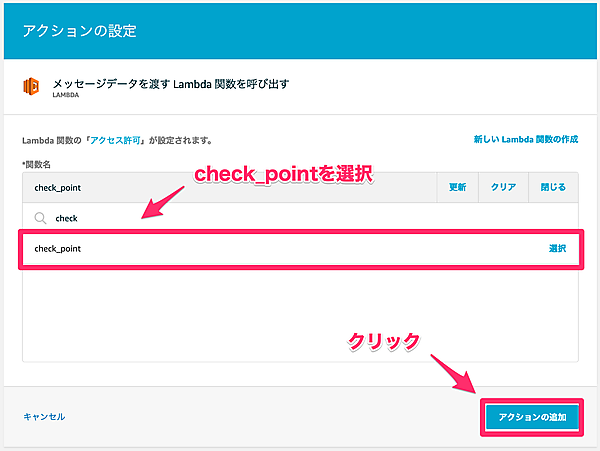 先ほど作成したLambda関数「check_point」を選択し、「アクションの追加」をクリックしてください。