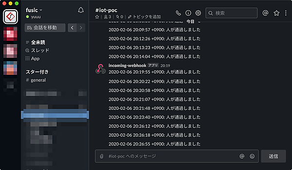 M5Stackの電源をONし、センサーの前に手をかざすと、Slackへ通知が来ることが確認できました。
