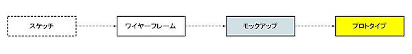 - 先輩:そしてアイコンやボタンなどのコンテンツを実物に近い部品にしたものが「モックアップ」で、さらに画面遷移やスクロールなど機能的な要素を付け加えたものが「プロトタイプ」という感じ。まあ、最近はツールが広範囲をカバーするから、これらのプロセスの境界がはっきりしなくなったけどね。