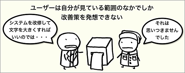 この例が表しているのは、「ユーザーは自分が見ている範囲のなかでしか、改善策を発想できない」ということです。「システムの改修」は現場の感覚としては「自分たちの手の届かないところ」だったので、無意識のうちに発想の幅を狭めてしまっていたのです。
