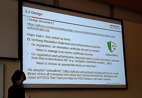 本セッションでは、筆者の同僚である日立製作所の乗松隆志氏が、Keycloakの「WebAuthn」という多要素認証やパスワードレス認証への標準対応について紹介した。