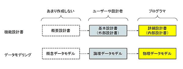 右欄は、基本設計書と詳細設計書にそれぞれのページが含まれるかを表したものです。第5回でデータモデリングの作業が(教科書的には)概念モデル→論理モデル→物理モデルと流れることを解説しましたが、機能設計書の作成も図1のように概要設計書→基本設計書→詳細設計書という順になります。そして、データモデリングで概念モデルをあまり作成しないように、通常は概要設計書を作成せずに基本設計書に概要部分も含ませます。