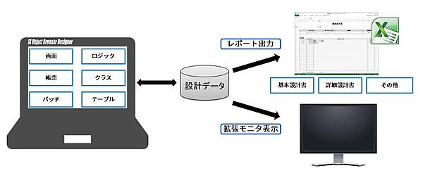 今回はOBDZの画面を用いて設計書フォーマットを解説するので、最初にCADで設計するイメージを共有しておきます。OBDZは世の中で使われている一般のCADと同じく、コンピュータ画面で設計作業を行い、設計書として印刷できます(図2)。具体的な方法としては、設計データをExcelで用意した標準フォーマットに落としてExcelファイルを作成するので、後はExcelの機能として印刷したりPDFファイルを作成したりできます。