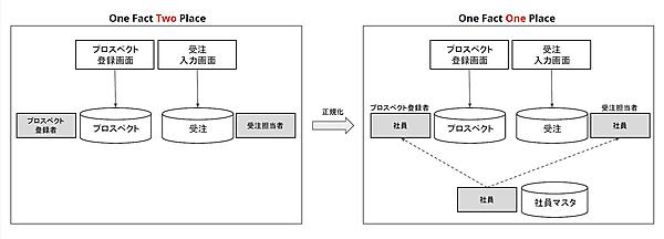 One Fact One Placeは、第5回で説明したDOA(Data Oriented Approach)の基本概念です。図4を例に説明しましょう。プロスペクト登録画面に対応するテーブルが「プロスペクト」、受注入力画面に対応するテーブルが「受注」だった場合、何も考えずに設計すればプロスペクト登録画面の「プロスペクト登録者」と受注入力画面の「受注担当者」はそれぞれのテーブルに個別にセットされます(図4左)。