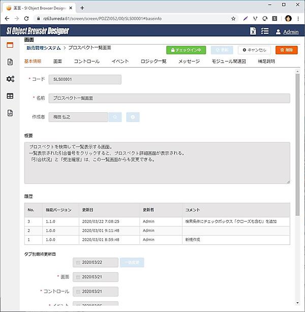 画面1は、OBDZで作成した「プロスペクト一覧画面」の「基本情報」タブです。機能コードや機能名、作成者など、表紙に表示される項目に続いて概要欄があります。機能仕様書を見る人(ユーザーやプログラマ、保守担当者、そして未来の自分自身)に対して、最初にどのような機能かを説明することが有効なのは異論がないはずです。しかし、エンジニアという生息域に住む人たちは、精緻なロジックを組み上げることは得意でも、ふわっと全体を俯瞰してアナログで語ることは苦手のようで、概要欄がない、もしくは概要欄があってもちゃんと記述されていない設計書が多いです。