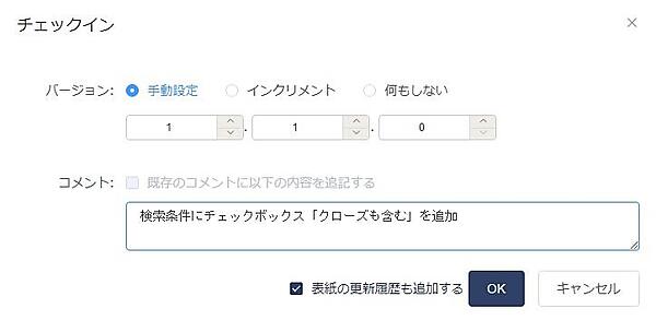 - 先輩:そうそう。で、話を戻すとOBDZは専用CADなので、わざわざバージョン管理ツールを使わずに自身でこの仕組みを持っているんだ。そこで、チェックインの際に自動的に画面2のような変更履歴記入ダイヤログを出すようにしている。このおかげで、うっかり変更履歴を書き忘れることが防げるんだ。