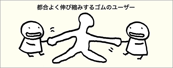 このように、想像でユーザー像を決めると、無意識のうちにステークホルダーに都合の良いユーザー像に寄ってしまいます。これをUXデザインでは「ゴムのユーザー」と呼びます。つくり手の都合で本当のユーザーを超えて、伸び縮みするからです。