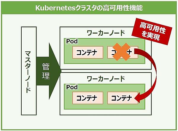 Kubernetesの高可用性は、クラスタ内にあるコンテナなどのコンポーネントに障害が発生した場合、当該コンテナを自動で再起動させたり、他のノードでコンテナを起動させ、故障したコンテナが実行していた処理を引き継がせたりと、事前に定義した状態を維持します(Self-Healing、図3)。