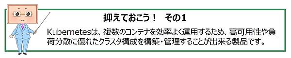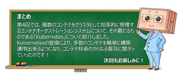 今回は、コンテナオーケストレーションシステムの代表格である「Kubernetes」について、その構成要素を紹介しました。Kubernetesは、クラスタ全体を管理統括するマスターノードと、実際にコンテナを動かすワーカーノードに分かれて稼動するコンテナのオーケストレーションシステムだということを覚えておいてください。